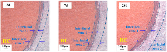 Transition zone of the cement paste–internal curing aggregate arch-shaped interface at various curing ages.