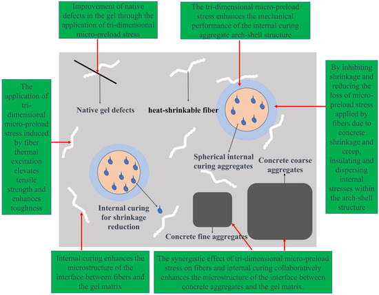 (1) Concept for synergistically enhancing concrete crack resistance: leveraging the high modulus of the heat-shrinkable fibers and their coupled effect of thermal shrinkage-induced contraction at the interface with the cementitious slurry, exerting three-dimensional micro-prestress on the concrete to improve its tensile strength and ductility, while simultaneously enhancing the mechanical properties of the arch-shell structure at the interface between the internal curing aggregate and the cementitious slurry; employing the internal curing aggregate to suppress concrete shrinkage and reduce the loss of micro-prestress caused by concrete shrinkage and creep; dispersing internal stresses by forming an arch-shell structure at the interface between the internal curing aggregate and the cementitious slurry [52,53,54,55,56]; employing porous internal curing aggregate for thermal insulation, thereby reducing temperature gradients within the concrete.
