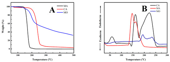The results regarding adhesive characterization (refer to Table 2) reveal that the MA adhesive has lower solids content, pH, and viscosity than the CA and MO adhesives. The lower pH and viscosity contributed to the lower quality of plywood bonded with MA adhesive. The short gelation time indicates that the adhesive no longer required a long setting time during hot pressing in the manufacture of composite products [59]. The average viscosity of the CA, MA, and MO adhesives is quite low compared to conventional formaldehyde-based plywood adhesives, such as UF resins with an average viscosity of around 250–400 mPa·s [59]. The viscosity value affects the ability of the adhesive to penetrate the pores of the wood and the storage life of the adhesive. Adhesives with high viscosity have a short storage life because they harden faster and the quality of the adhesive is low [59]. Notably, the MA and MO adhesives have lower thermal degradation (145 °C and 150 °C) compared to the CA adhesive (165 °C) (Figure 1A). However, the MO adhesive also has a higher first endothermic peak (200 °C) compared to the MA and CA adhesives (140 °C and 159 °C) (Figure 1B). These phenomena resulted in low TSS in plywood bonded with MO adhesive.