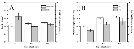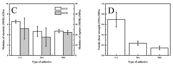 Influence of non-formaldehyde adhesive type on the properties of plywood. Note: error bars represent the standard deviation. (A) Density and moisture content, (B) water absorption and thickness swelling, (C) modulus of elasticity and rupture, and (D) Tensile shear strength.