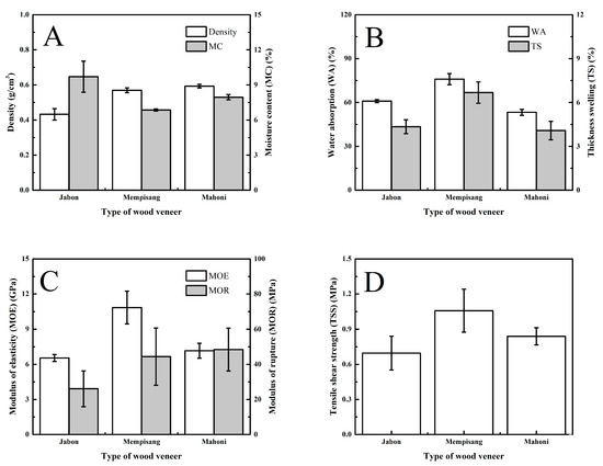 Influence of type of wood veneer on the performance of plywood. Note: error bars represent the standard deviation. (A) Density and moisture content, (B) water absorption and thickness swelling, (C) modulus of elasticity and rupture, and (D) Tensile shear strength.