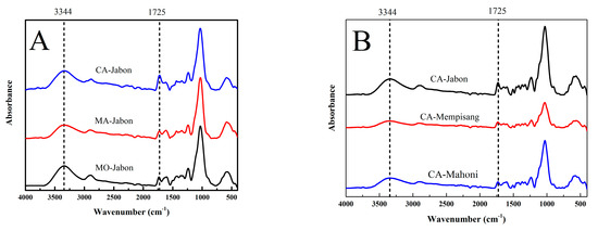 The FTIR spectrum of plywood using different types of non-formaldehyde adhesive and wood veneers is shown in Figure 4. The difference is visible at approximately 1725 cm−1. The peak of plywood bonded with CA, approximately 1725 cm−1 (ester linkages), was greater (Figure 4A) than that of plywood bonded with MA and MO [52]. This distinction in peaks contributes to the superior performance of CA-bonded plywood when contrasted with MA- and MO-bonded plywood. In addition, the peaks at 1725 cm−1 (ester linkages) and 1040 cm−1 (hemiacetal’s C-O-C) in plywood from Jabon wood veneer were higher than those from Mahogany and Mempisang wood veneer (Figure 4B). This observation explains the similarity in TSS between plywood from Jabon wood veneer and plywood from Mahogany wood veneer, despite the lower density of Jabon wood. The peak at 1725 cm−1 signifies ester linkages, and the peak at 1040 cm−1 corresponds to hemiacetal’s C-O-C stretching vibration, resulting in the esterification of CA with lignocellulose materials [63,65].