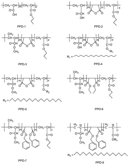 Chemical structures of the prepared pour-point depressants: PPD-1, PPD-2, PPD-3, PPD-4, PPD-5, PPD-6, PPD-7, and PPD-8.