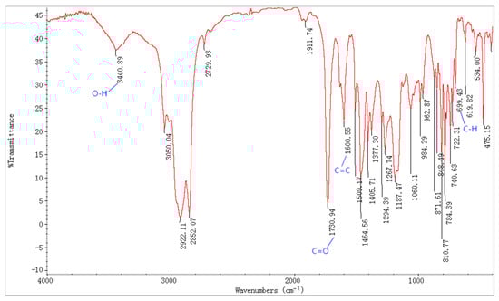The chemical structure of the pour point depressants was determined by FT-IR spectroscopy. The FT-IR spectrum of PPD-8 is shown in Figure 2. The O-H absorption peak can be seen in 3440 cm−1. The absorption peak of aromatic ring C=C was 1600 cm−1. The carbonyl stretch vibration peak can be seen in 1730 cm−1. The characteristic C-H of aromatic ring absorption peak at 699 cm−1. It was confirmed that the acrylic ester and maleic anhydride had copolymerized and proved that we chose the right selected method to copolymerized. Additionally, the results obtained from other Fourier Transform Infrared Spectroscopy (FT-IR) analyses also demonstrated the successful execution of the synthesis process.