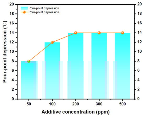 In Figure 3, it can be seen that the pour point depressant effect was poor when the concentration of the additive was low. When the concentration was increased to 200 ppm, the pour point depressant effect was better and the reduction in pour point reached 14 °C. If the concentration was further increased, the effect of the pour point depressant will not change much, which is not economically feasible and will increase the cost. Therefore, the optimal concentration for PPD-8 was 200 ppm.