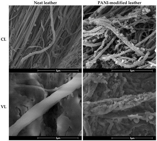 The morphology of the PANI coating on the surface of CL and VL was further studied using SEM (Figure 2). The SEM images show clear differences in surface morphology between neat and PANI-coated leathers. As a result of the coating process, the surface morphology of the collagen fibrils was changed from smooth to a rougher one due to the formation of PANI aggregates. Furthermore, while an average diameter of collagen fibrils of neat leathers was 0.19 µm, it was increased to about 0.28 µm for PANI coated leathers (Figure S5 and Table S1). This increase in the fibril thickness indicates the formation of PANI coating with a thickness of about 100 nm. The obtained results are in good agreement with the ones previously reported for PANI coated viscose fabric produced using similar method [55].