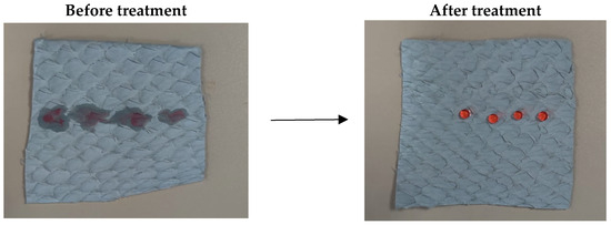 Photographs (samples of 5 × 5 cm) of CL before and after UC treatment taken using drops of water (dyed red).