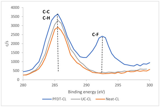 Furthermore, both PFDT modified VL and CL showed significant amounts of fluorine atoms for the PFDT-modified leather with at least 20% of the surface composition even after excessive Soxhlet wash, as well as the substantial peak at 292 eV in binding energy spectra, which was ascribed to F-C bond (Figure 4 for CL and Figure S3 for VL). These results confirm a chemical grafting to the leather surface, which occurred between the double bond of UC and the thiol group of PFDT. Moreover, the amount of chromium detected on the surface for each modification stage was reduced from 2.09% for the neat to 1.47% for the UC- modified and to 0.56% for the PFDT-modified CL leathers. These results support the formation of thin coating layers on the surface of the leather due to the covalent binding of small functional molecules.