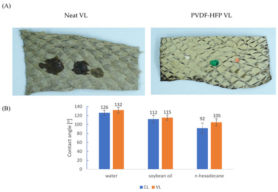 (A) Photographs (samples of 1 × 3 cm) of VL before and after PVDF-HFP modification taken using drops of water (dyed red) soybean oil (dyed green) and n-hexadecane. (B) Contact angle values of PVDF-HFP coated leathers.