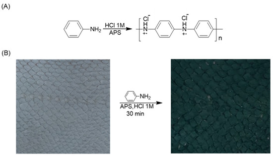 The coating of the fish leathers with PANI was carried out via in-situ polymerization of aniline according to our previously published method [50]. CL and VL samples (100 cm2) were immersed in 160 mL HCl 1M solution containing 3.44 mL aniline (0.038 mol) and mixed using an orbital shaker for 5 min (70 rpm). Then, 40 mL of HCl solution containing 10.7 g of APS (0.046 mol) was introduced to the vessel, and the polymerization was carried out for 30 min. The coated leathers were washed with water and ethanol, and dried overnight.