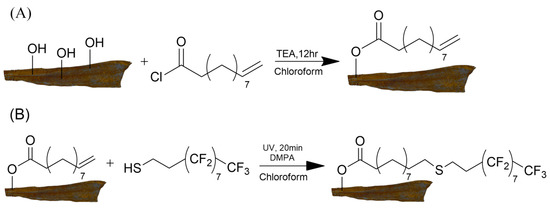 (A) Surface covalent modification of leather with UC. (B) Functionalization of UC-grafted leather with PFDT.