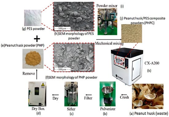 The preparation flow chart of the PHPC composite: (a) raw peanut husk material, (b) pulverizer machine for crushing, (c) sifter machine for sifting powders after crushing, (d) furnace device, (e) samples of pure PHP, (f) SEM morphology of pure PHP, (g) pure PES powders, (h) SEM morphology of pure PES powders, (i) powder mixing machine, (j) PHPC samples, and (k) 3d printing machine.