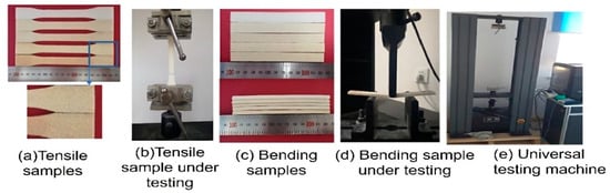 The ASF-360 SLS process yielded PES and PHPC parts with high forming quality and smooth brown surfaces (Figure 3a,b). The produced PHPC parts showed good mechanical strength and dimensional accuracy, making this approach suitable for AM technology in manufacturing construction components, furniture, and wooden floors. Figure 8 depicts photographs of the bending, tensile, and impact tests on the PHPC SLS samples manufactured with various PHP particle sizes before and after mechanical testing.