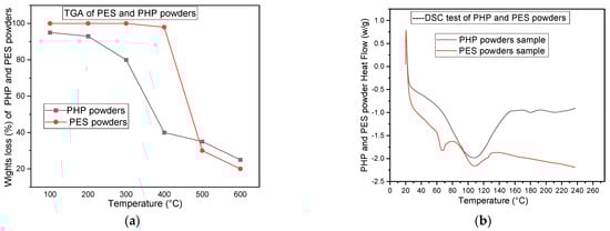 TGA and DSC curves of PHP and PES powders, displayed in (a) and (b), respectively.