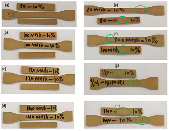 PHPC SLS samples with different PHP particle sizes (≤0.149 mm, ≤0.125 mm, ≤0.105 mm, and ≤0.088 mm), respectively, before and after mechanical testing: (a–d) PHPC SLS parts subjected to bending, tensile, and impact tests before mechanical testing, and (e–h) the samples after breakage during mechanical testing.