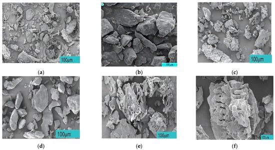 Surface morphology of different samples: (a) pure peanut husk powder (PHP) sample, (b) pure PES sample, (c) PHPC parts with PHP particle size ≤0.149 mm, (d) PHPC parts with PHP particle size ≤0.125 mm, (e) PHPC parts with PHP particle size ≤0.105 mm, and (f) PHPC parts with PHP particle size ≤0.088 mm.