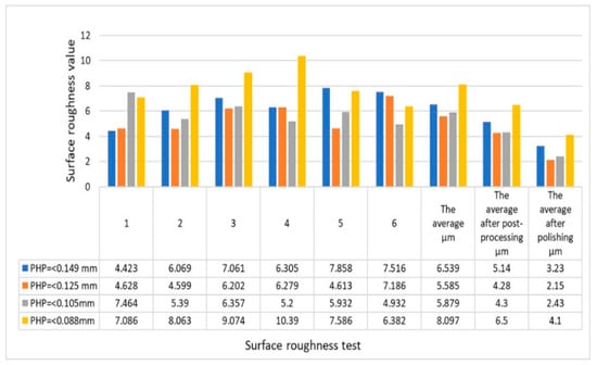 Surface roughness of the PHPC SLS parts made from various PHP particle sizes before and after post-processing (wax infiltration and polishing).