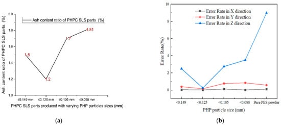 The ash content (a) and error rate (b) of the PHPC SLS parts produced using different PHP particle sizes.