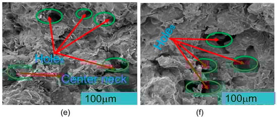 SEM examination was performed on PHPC SLS samples both before and after mechanical testing to assess deformation resulting from the breakage during the mechanical test (Figure 13a–d), which was discussed earlier in Section 3.3. Additionally, SEM analysis was carried out on the cross-section morphologies of PHPC SLS samples with PHP ≤ 0.149 mm and PHP ≤ 0.125 mm, before and after treatment via wax infiltration (Figure 13e,f), to show the positive impact of the wax infiltration method. Therefore, the PHPC SLS part with PHP ≤ 0.125 mm exhibited a relatively higher density and smaller internal holes compared to the part with PHP ≤ 0.149 mm (Figure 13a,c). Following the wax treatment, the size and quantity of internal holes in the PHP ≤ 0.125 mm part slightly reduced, and the bonding interface became relatively loose (Figure 13f) in comparison to the waxed parts of PHP ≤ 0.149 mm and PHP ≤ 0.088 mm (Figure 13e). The primary reason behind this observation is that in the case of PHP ≤ 0.125 mm, the internal structure of the PHPC SLS part is dense, making it difficult for liquid wax to permeate inside and fill the internal holes. For larger and smaller particle sizes (PHP ≤ 0.149 mm and PHP ≤ 0.088 mm), the internal structure of the PHPC SLS parts is relatively loose, facilitating easy permeation of the liquid wax inside. Consequently, excellent waxed parts of PHPC were obtained for parts with weak and low density (PHP ≤ 0.088 mm and PHP ≤ 0.149 mm), respectively. As a result, the quantity rate of internal pores in the waxed (PHP ≤ 0.125 mm) part was higher than parts of PHP ≤ 0.149 mm, and the sintering neck was small (Figure 13e,f). From the SEM analysis, it was determined that the PHPC part with PHP ≤ 0.125 mm had fewer pores and denser structures in PHPC SLS. However, the wax treatment had a weaker influence due to the low liquid wax permeability inside the holes of PHPC SLS. Consequently, the wax treatment had a more significant impact on the PHP ≤ 0.149 mm part compared to the PHP ≤ 0.125 mm part.