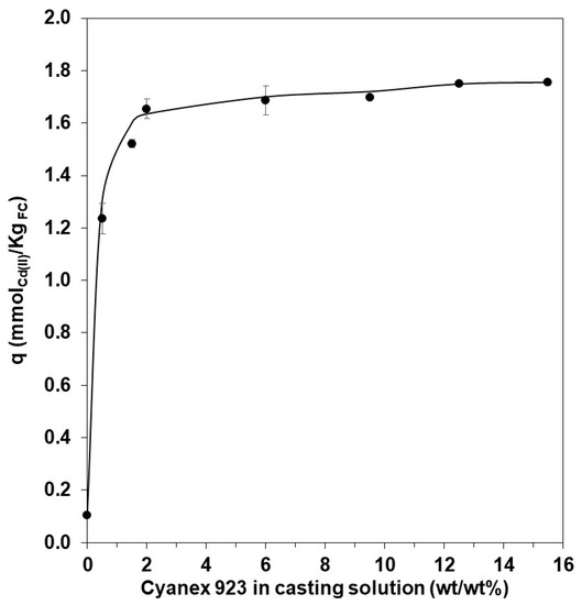 Effect of variation of the concentration of Cyanex 923 used for obtaining the capsules (FC). Experimental conditions: 10 mg L−1 of Cd(II) in aqueous solution in 2 mol L−1 of HCl; 0.5 g of FC. Values obtained after 2 h were counted from the start of the experiment.