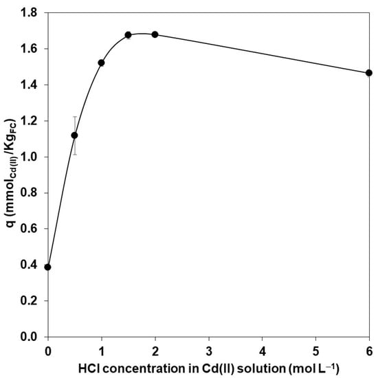 Different amounts of FC were mixed with a Cd(II) solution of 10 mL and an initial concentration of 10 mg L−1 in HCl. The total of Cd(II) extracted (q) was calculated according to the following Equation (1):
