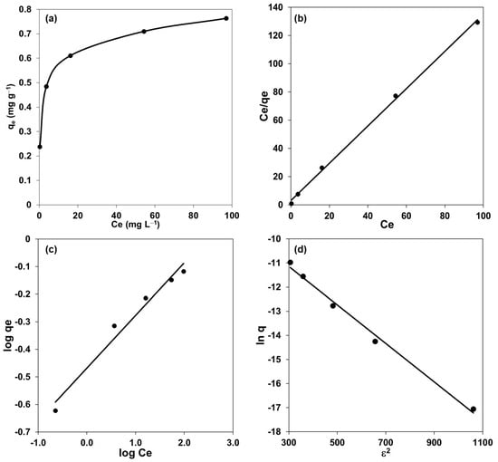 Isotherms curves: (a) experimental data and linearized forms of (b) Langmuir isotherm, (c) Freundlich isotherm, and (d) Dubinin Radushkevich isotherm. Experimental conditions: different amounts of Cd(II) in aqueous solution of 1.5 mol L−1 HCl; 0.5 g of FC prepared to 1.5% of Cyanex 923.