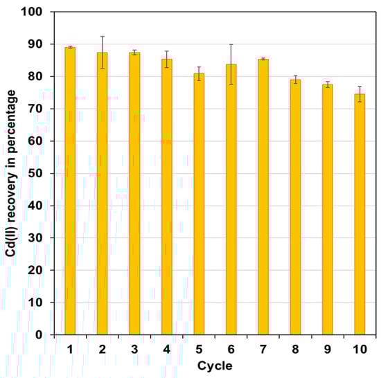 Sulphuric acid is an effective re-extracting agent because it can form more stable complexes with cadmium in aqueous medium than chloride [49]. Thus, H2SO4 was used to recover cadmium from the functionalized capsules (10 mL of H2SO4 0.1 mol L−1 in each experiment). Subsequently, the cadmium-free FCs were used again for extracting Cd(II), completing a new cycle. With these results, it was possible to evaluate the stability and durability of the FC, inferring a loss of its extraction capacity after the seventh cycle (Figure 7).