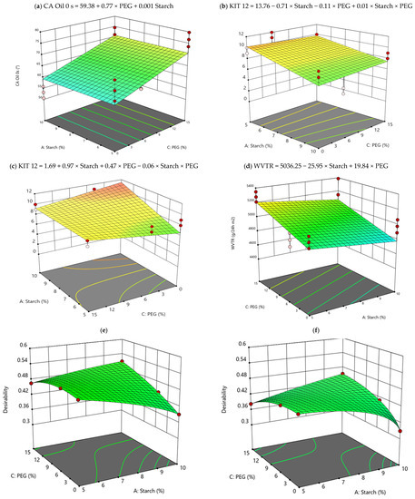 Response surface graph of the most representative mathematical models calculated: (a) CA oil 0 s; (b) KIT12 with agar; (c) KIT12 without agar; (d) WVTR with agar; (e) Desirability function with agar; (f) Desirability function without agar.