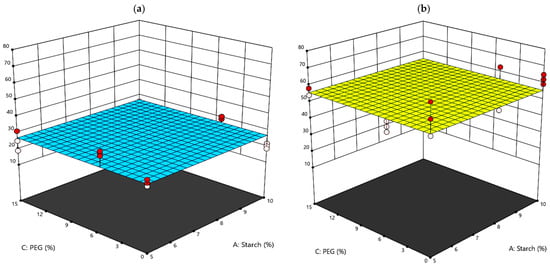 Furthermore, the tensile strength and thickness variables are inversely related to each other, as we can see in the load graph PC1 and PC2. Therefore, at greater coating thickness, lower values of tensile strength are observed. Finally, grammage is inversely related to the water CA value (CA-H2O 0 s, 15 s, 30 s), thereafter indicating that some restrictions on the coating formulation must be applied to balance these two responses. For this reason, it is necessary to calculate the best coating formulation to satisfy all the output variables through a desirability function as explained in Section 2.4. In fact, with the desirability function, we can take in consideration the synergic effect among variables and calculate the optimum conditions of work which in this case is the best coating formulation. The results of the calculation of this function are graphically shown in Figure 3, where the graphs are reported for the two conditions: with and without agar, respectively; see Figure 3e,f. It is possible to see the condition with the higher desirability regarding the formulations with agar (Figure 3e) showing desirability over 0.5. More in depth, the calculated best coating formulation is 10% w/w PCL dry weight starch, 1.5% w/w PCL dry weight agar, and 15% w/w PCL dry weight PEG, showing that all the compounds investigated in this study are relevant to produce the more promising coating for packaging paper.
