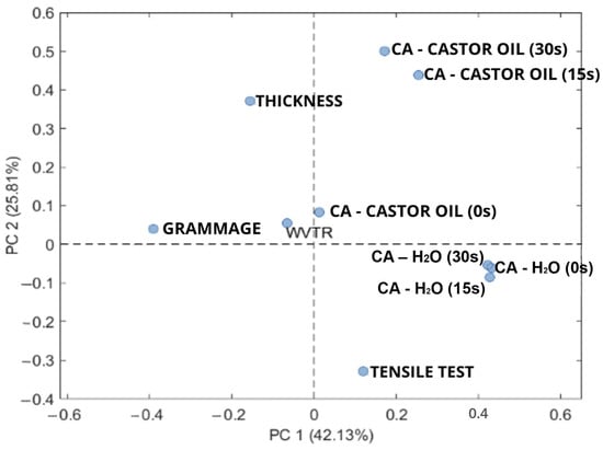 Instead, the relatively low water CA measured on all the coated samples can be explained by the surface roughness induced by the coatings, despite their good spreadability and penetration ability. The WVTR of the coated samples decreased, but not significantly, and only for the SET 1 and SET 2 samples with respect to the average high value determined for the control paper (WVTR 5157 g m−2 day−1, tropical conditions) despite its high-water CA. There does not seem to be a relationship between water CA and WVTR; in a previous work, for example, it was demonstrated that a commercial fluorinated paper had a very high value of WVTR (2825 g m−2 day−1) but also a high value of water CA (around 135°), and a polyethylene coated paper had a low WVTR (72 g m−2 day−1) and a low water CA (around 100°) [11]. If the grease resistance properties are concerned, the results obtained by the Kit Test demonstrated that all the coated samples reached a value higher than 8 despite their oil CA < 90°, confirming that a direct correlation between wettability and oil absorption and diffusion into the paper structure probably does not exist. Taking into account all the previous results, a complete comparison of the obtained data has been reported through PCA and multivariate analysis in which a desirability function has been finally calculated. The optimal dimensionality of the PCA model, i.e., the number of PCs to consider, was defined using the screen plot, a graph that displays the percentage of variance explained by each PC. In this specific study, it was decided to consider two principal components, where PC1 describes 42.13% of the explained variance, while PC2 describes 25.81% of the explained variance. To fully interpret the results of the PCA model, it is necessary to combine the scores graph (Figure S2) with the loading graph (Figure 5). The scores graph allows one to evaluate the relationships between samples, while the loading graph allows for an evaluation of the relationships between output variables. In the score graph (Figure S2), we can see a clear separation of two groups of samples mainly along PC2, namely, the agar-coated group in red (having PC2 positive values), the group without agar in green (with negative PC2 values), and the control samples, represented in blue, clearly separated from the other samples along PC1. It can therefore be stated that PC1 mainly distinguishes between the control samples and the coated paper samples prepared in this study, while PC2 allows for distinguishing between the samples covered with agar and the samples without agar. Comparing the graph of scores with that of loads (Figure 5), we can also see that the samples with agar, positioned at positive values of PC2, show high values of thickness and high levels of CA OIL (0 s, 15 s, and 30 s), as they are variables with positive loading values along PC2, indicating that agar has a more positive influence on these responses, especially in oil resistance. The addition of starch, as also demonstrated by Eslami et al. [36], even at its lowest level (5% w/w PCL dry weight), is fundamental for this property as it has a relevant influence on the CA measured with oil. The improvement of the grease resistance by the introduction of starch is also demonstrated by the test kit results; all the samples recorded a kit value greater than 8. Samples with any result number higher than 8 are considered grease resistant; similar results were obtained also from Nair et al. [7], and the introduction of starch to obtain the paper coating in their samples led to a marked improvement in oil resistance, with Kit 12 values exceeding 7. In addition, agar presence in combination with PEG has been shown to play a beneficial key role in improving oil resistance and decreasing water vapor transmission rate. Similar results were obtained by Amariei et al. [37], nevertheless, causing a significant detriment to the mechanical properties.