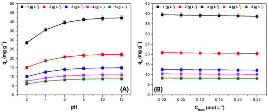 All adsorption experiments were carried out in batch mode using three independent replicates, using a volume of dye solution of 50 mL. The values of the main parameters that affect the process varied as follows: pH = 2–12, stirring time = 1–60 min, initial dye concentration = 25–700 (mg L−1), adsorbent dose = 1–6 (g L−1), temperature = 285–319 K, and ionic strength = 0–0.25 (mol L−1). Dilute solutions of HCl 0.1 (mol dm−3) and NaOH 0.1 (mol dm−3) were used for pH adjustment and the ionic strength was modified by adding solid NaCl. The crystal violet concentration was measured with a Specord 200 PLUS UV-VIS spectrophotometer (Analytik Jena, Jena, Germany) at a wavelength of 590 nm.
