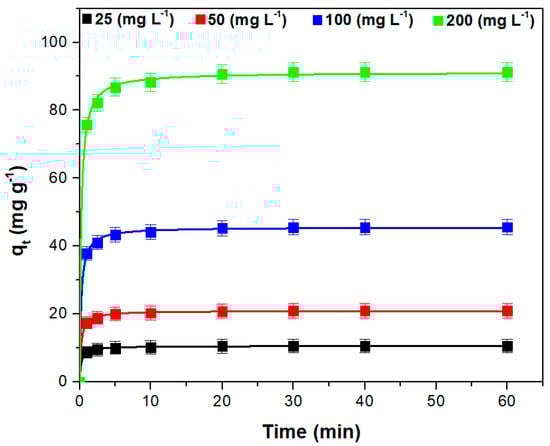 | qe,calc (mg g−1) | 10.33 ± 0.27 | 20.45 ± 0.62 | 44.33 ± 1.78 | 89.04 ± 3.75 |