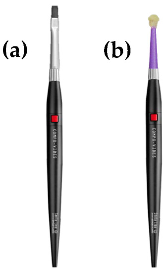 Representative images of the Compo-Vibes (Smile Line, St-Imier, Switzerland) instrument (an application modality could be possible with the help of the Compo-Vibes (Smile Line, St-Imier, Switzerland) brush in (a) used for bonding in this study or by using a micro-brush in (b)).