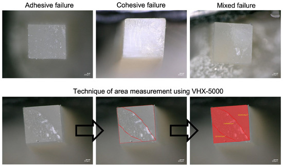 Representative images were obtained with an optical microscope at 150× magnification to recognize the failure mode in each specimen. The technique of area measurement was conducted using the VHX-5000.