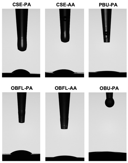 Representative images of the contact angles of different adhesives. All adhesives were measured after 10 s of contact by using a horizontal camera to track their profiles. The placement of the adhesive quantifies the intrinsic aptitude of the adhesive liquid to spread on a flat and solid dentinal substrate. Clearfil SE Bond (CSE); OptiBond FL (OBFL); OptiBond Universal (OBU); Prime&Bond Universal (PBU); Active application (AA); and Passive application (PA).