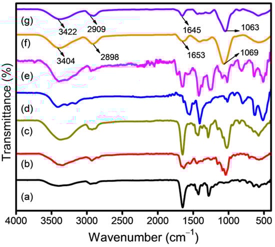 FTIR spectra of (a) CS, (b) TPP, (c) CSNPs, (d) CP, (e) FA, (f) CP-loaded CSNPs, and (g) FA-loaded CSNPs.