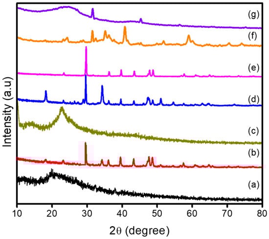 XRD pattern of (a) CS, (b) TPP, (c) CSNPs, (d) CP, (e) FA, (f) CP-loaded CSNPs, and (g) FA-loaded CSNPs.