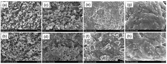 SEM images of (a,b) CSNPs, (c) CP, (d) FA, (e,f) CP-loaded CSNPs, and (g,h) FA-loaded CSNPs.