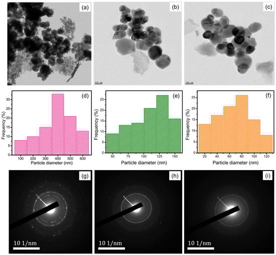 TEM images of (a) CSNPs, (b) CP-loaded CSNPs, and (c) FA-loaded CSNPs and their particle size distribution (d–f) and SAED pattern (g–i).