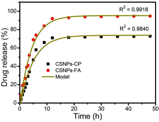 A time-dependent drug release profile was performed under physiological conditions while CP-loaded and FA-loaded CSNPs were submerged at 37 °C in PBS (pH 7.4) to assess their drug release profiles. Desorption, erosion, degradation, reabsorption, and diffusion mechanisms of the polymeric network resulted in the release of the CP and FA from the prepared CSNPs [,]. In order to be efficient, a drug delivery system should have a high degree of drug association. For example, a typical biphasic release trend was observed in CP-loaded CSNPs where approximately 66.4 ± 1.6% of CSNPs were released within the first 9 h of the study, while the remaining 72.9 ± 3.6% of the drug was released in 48 h []. In addition, an initial burst in the release of FA-loaded CSNPs was observed within 9 h, and 84.2 ± 2.1% of FA drug was released, followed by a sustained release profile for 48 h at 94.8 ± 2.9%, indicating the potential of CSNPs-FA as a sustained drug delivery system []. The hydrophobic nature of the drugs allowed for a high EE, as they are able to enter nanocarrier systems more easily. These results indicate an ionic interaction between the CSNPs and TPP for CP and FA. According to the work of Zaman et al. [], the drug was released in a burst of about 35% over a period of 24 h, while in our investigation with CP- and FA-loaded CSNPs, about 66.4 ± 1.6% and 84.2 ± 2.1%, respectively, of the drug was released in the first 9 h. Our results suggest that the higher amount of CP and FA drugs dispersed or near the surface of the CSNPs may account for the burst release []. In 48 h, CP and FA drugs were released from the CSNPs in amounts of 72, 9.3% and 94.8%, respectively. On the other hand, the obtained dissolution results were found to fit the first-order kinetic model well. This model suggests that the CP and FA kinetic release constant (k) did not change throughout the study. Despite CSNPs-FA exhibiting a ~22% higher maximum drug release amount (Fmax) than that shown by CSNPs-CP, their kinetic release constant seems to be 0.198 and 0.221 in CP-loaded CSNPs and FA-loaded CSNPs, respectively, as described in Table 1 and Figure 5. By partitioning between CSNPs and the surrounding aqueous phase, we suggest that both CP and FA-loaded CSNPs release profiles are controlled by diffusion mechanisms. From the graph, the sustained release rate can be attributed to the intermolecular interaction formed by the dispersion of the CP-loaded CSNPs and the FA-loaded CSNPs matrix [].