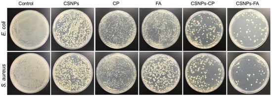 Antibacterial activity of the control, CSNPs, CP, FA, CP-loaded CSNPs, and FA-loaded CSNPs against Escherichia coli and Staphylococcus aureus bacteria.