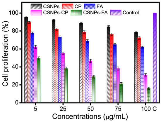 Cytotoxicity assay of CSNPs, CP, FA, CP-loaded CSNPs, FA-loaded CSNPs, and the control against HCT-116 cells at 24 h of incubation.