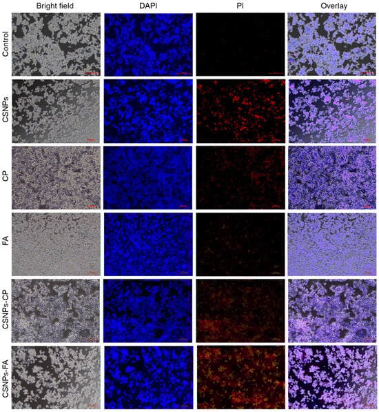Fluorescence micrographs of DAPI and PI-stained HCT-116 cells treated with control, CSNPs, CP, FA, CP-loaded CSNPs, and FA-loaded CSNPs. (Scale bar ~100 μm).