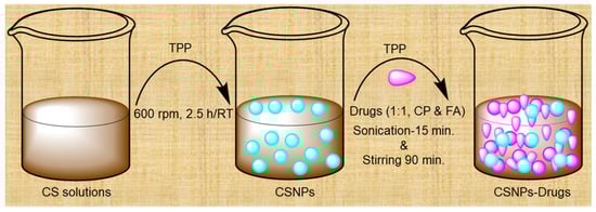 Schematic representation of the formation of CSNPs and drug-loaded (CP and FA) CSNPs via TPP using the ionotropic gelation method.