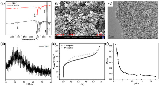 The surface functional groups in CPOP and 3CZ-TPA were determined by FTIR spectra as shown in Figure 1a. CPOP and 3CZ-TPA showed a peak appearing at about 1508 cm−1 and 1458 cm−1 that is assigned to the stretchable vibration peaks of aromatic unsaturated C=C. The characteristic peak at 3044 cm−1 is the stretching vibration peak of aromatic unsaturated C-H in 3CZ-TPA. The peaks located at 744 cm−1 and 719 cm−1 are four adjacent hydrogen bond bending and vibration peaks on the benzene ring of the carbazole group. The characteristic peak of CPOP here is significantly smaller than that of 3CZ-TPA, which is attributed to the polymerization of carbazole. Additionally, CPOP shows a new peak at about 804 cm−1, which belongs to dimeric carbazole [29]. The peak intensity at 744 cm−1 and 719 cm−1 especially decreased significantly, and the production of new peaks indicated that CPOP had been successfully synthesized.