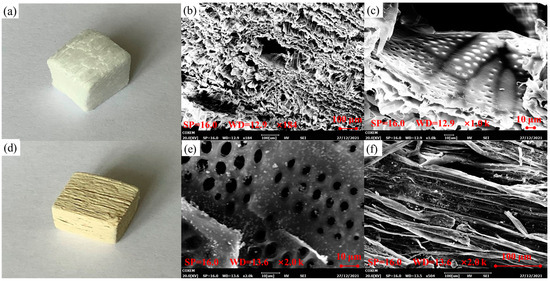 The morphology of wood aerogels and CPOP-loaded wood aerogels was analyzed by SEM. The wood aerogels, after the completion of the treatment, showed white color (Figure 2a), with cellulose structures uniformly arranged in their longitudinal direction. It can be seen from Figure 2b that, after removing the lignin and hemicellulose as fillers or carriers, the interior of the wood aerogel was uniformly arranged with a pore structure, and the size of the pore structure was about 70–100 μm in size. Figure 2c shows the lateral structure of wood aerogel, which inherits the 3D structure of natural wood and has the advantages of high porosity and high specific surface area; the pore diameter is about 10–60 μm. Further magnification of the void structure shows that there are still many small pores inside the void, indicating that the wood aerogel is a multi-dimensional network porous material.