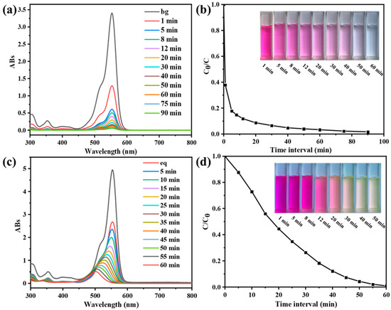 CPOP has the characteristics of high specific surface area, hierarchical pore structure etc. In addition, it has conjugated structure and high electron density at the nitrogen atom, which helps to adsorb small organic adsorbent, and can be used as an adsorbent to adsorb pollutants in water. The CPOP was ground and processed into powder, and the adsorption–desorption test of RhB was carried out under dark conditions; the results are shown in Figure 3. It can be clearly found from Figure 3a that the absorbance of the RhB characteristic peak (at 554 nm) gradually weakens as the absorption time continues to increase, and there is no movement of the characteristic peak. This shows that the content of RhB decreases and no new substances are formed in the adsorption–desorption process, which is attributed to physical changes. It can be seen from Figure 3b that the adsorption of CPOP to RhB is very fast in the first 5 min, which is caused by the microporous structure in CPOP, and dye absorption quickly reaches the plateau after 10 min, at which point 90% of the dye is adsorbed. The adsorption amount gradually decreases and the desorption amount increases gradually at 20–90 min, and finally it tends to the equilibrium state. CPOP completely adsorbs RhB in about 60 min, which also reflects that CPOP has a large specific surface area. During different adsorption–desorption time periods, the color of RhB gradually became lighter, from red to colorless, which indicated that it had good adsorption performance (Figure 3b, inset). The maximum adsorption capacity of RhB is 530 mg/g. From these results, CPOP is considered an outstanding candidate for removing RhB from water. In other words, a large number of carbazole building units showed excellent removal efficiency for water-soluble cationic organic dyes.