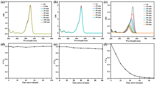 When the width of CPOP’s own energy band is less than or equal to the energy of the photon it absorbs, the photoelectrons in CPOP can jump from the valence band to the conduction band with high energy [35]. Therefore, CPOP generates electrons in the conduction band and holes in the valence band when excited by photons, resulting in an oxidation reaction capability. The generated photogenerated holes will come into contact with water and oxygen in water to generate hydroxyl radicals and peroxyl radical anions during photon excitation. Therefore, this experiment studied the role of electrons, holes, peroxyl radicals, hydroxyl radicals and singlet oxygen in the photocatalytic reaction process. A series of different capture agents were added to the CPOP degradation RhB solution to explore the effect of different capture agents, where no trapping agent was added as a blank control group (Figure 5a). Methanol was used as a hole trap and electron trap (Figure 5b), isopropanol as a hydroxyl radical trap (Figure 5c), potassium dichromate as an electron trap (Figure 5d), and p-benzoquinone (BQ) as a trap for peroxyl radicals (Figure 5e).
