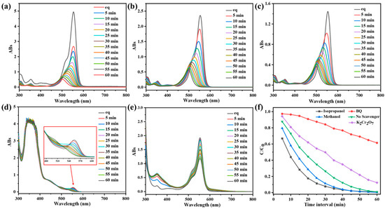 UV-vis spectra of RhB (10 mg/L) after different illumination time intervals in the presence of CPOP with different scavengers: (a) the blank control group, (b) methanol, (c) isopropanol, (d) potassium dichromate and (e) p-benzoquinone. (f) Effect of the different scavengers, the blank control group, methanol, isopropanol, potassium dichromate and p-benzoquinone, on the degradation of RhB over CPOP under 60 min of visible-light irradiation.