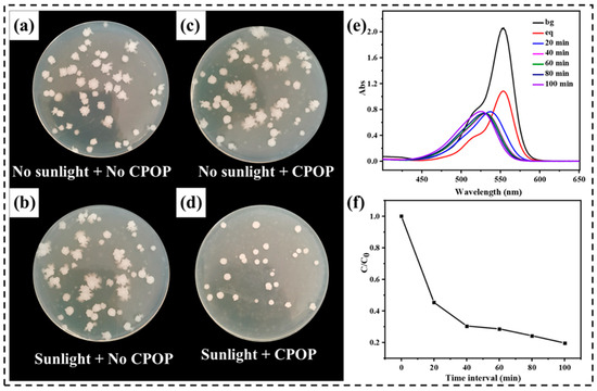 In recent years, antimicrobial photodynamic therapy (PDT) has shown great promise as an alternative method for bacterial disinfection. Compared with traditional inactivation methods, PDT has the advantage of not inducing resistant strain selection because its mode of action is based on the production of reactive oxygen species (ROS) by light irradiation. Based on the excellent physicochemical stability, unique functional group, photocatalytic activity and peroxy free radical action of CPOP, the prepared polymer should be a good antibacterial agent [33]. The visible-light-promoted antibacterial disinfection ability of the CPOP was evaluated using Escherichia coli K-12 as Gram negative model systems. In this study, a suspension of bacteria was incubated with CPOP and exposed to sunshine light irradiation. As a note, all CPOP showed no toxic effects on bacteria cells in the absence of sunshine irradiation as shown in the dark experiment (Figure 6a,b). As shown under the same incubation conditions and concentration, the number of E. coli in the sunlight + CPOP was the lowest, indicating that its antibacterial activity was the highest, and CPOP was an effective antibacterial agent (Figure 6d). Figure 6c shows that CPOP itself has excellent biocompatibility, and its antibacterial activity is activated by photocatalysis to produce peroxy free radicals. Therefore, the active sites in the CPOP network and its inherent physicochemical properties are the reasons for its excellent antibacterial activity, which further broadens its application field and value.